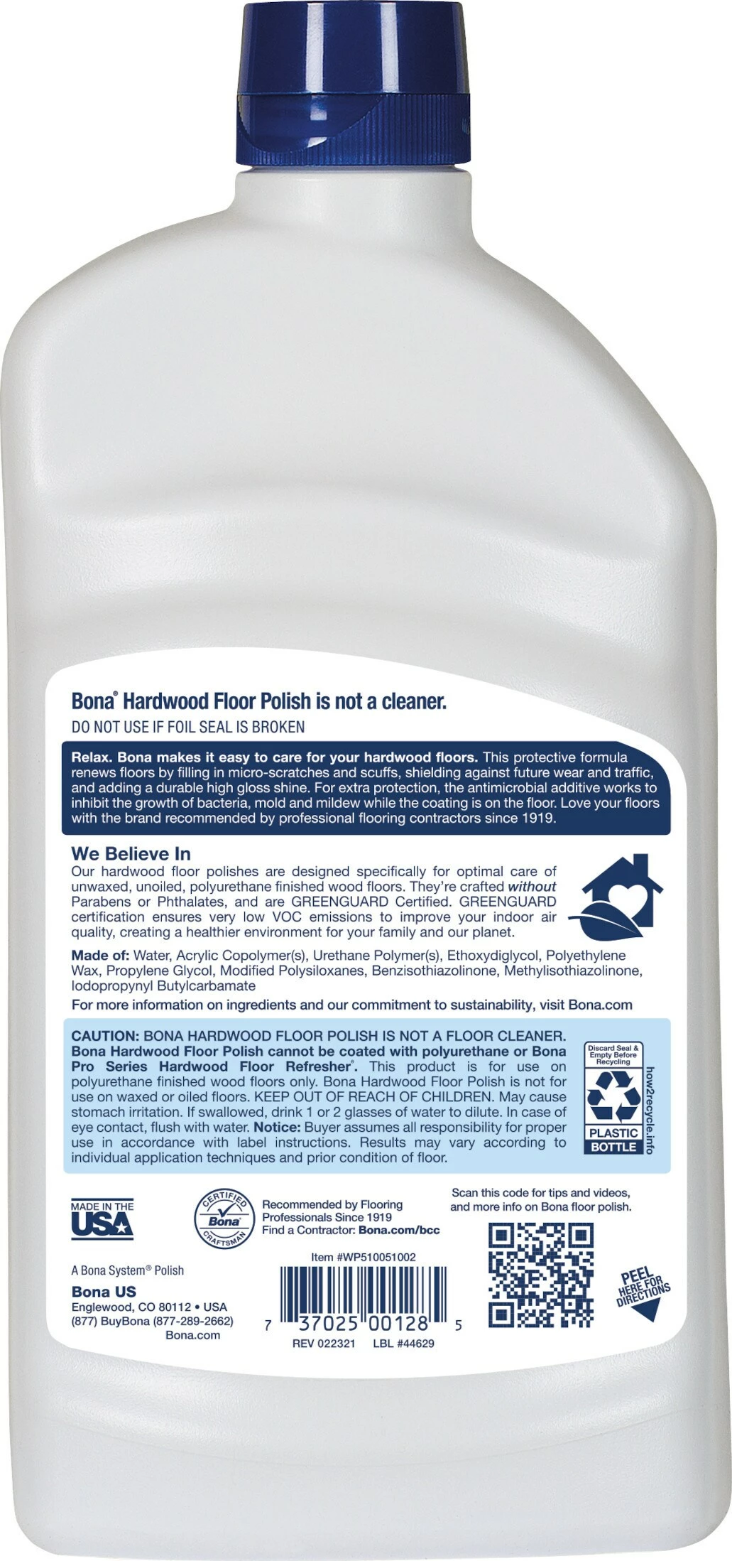 Bona® Hardwood Floor Polish offers a protective formula that renews floors by filling in micro-scratches and scuffs, shielding against future wear and traffic, and adding a durable high gloss shine. For extra protection, the antimicrobial additive works to inhibit the growth of bacteria, mold and mildew while the coating is on the floor. Use every 2-4 months to keep floors revitalized and looking their best. Covers about 500 sq. feet.