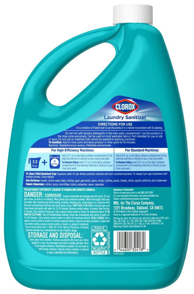 Clorox® Laundry Sanitizer gets right to the source of tough fabric odors while killing 99.9% of odor-causing bacteria. This in-wash product penetrates deep into fibers to eliminate laundry odors and tough stains, as it leaves behind a fresh clean scent. The bleach-free formula sanitizes full laundry loads and removes odor-causing bacteria, including odors that detergents may leave behind. Perfect for the unexpected diaper blowout, food and pet odors, stinky towels, sweaty clothes, children’s sports uniforms and anything else life throws at you. This liquid formula sanitizes in the rinse cycle to help freshen up fabrics and extend the life of your garments by eliminating odors. Safe for colored fabrics and whites, and compatible for all machines. Power through life’s laundry challenges and eliminate tough odors at their source with the Clorox® brand you can trust.