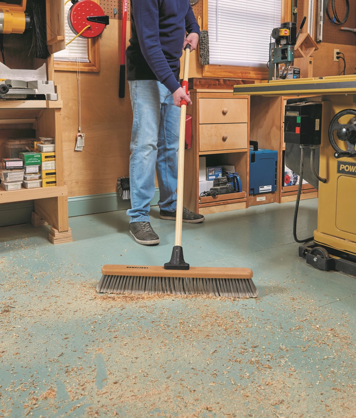- Shop/garage broom is ideal for sweeping fine, dry dust, and dirt particles such as sand, saw dust, wood shavings, and pet hair