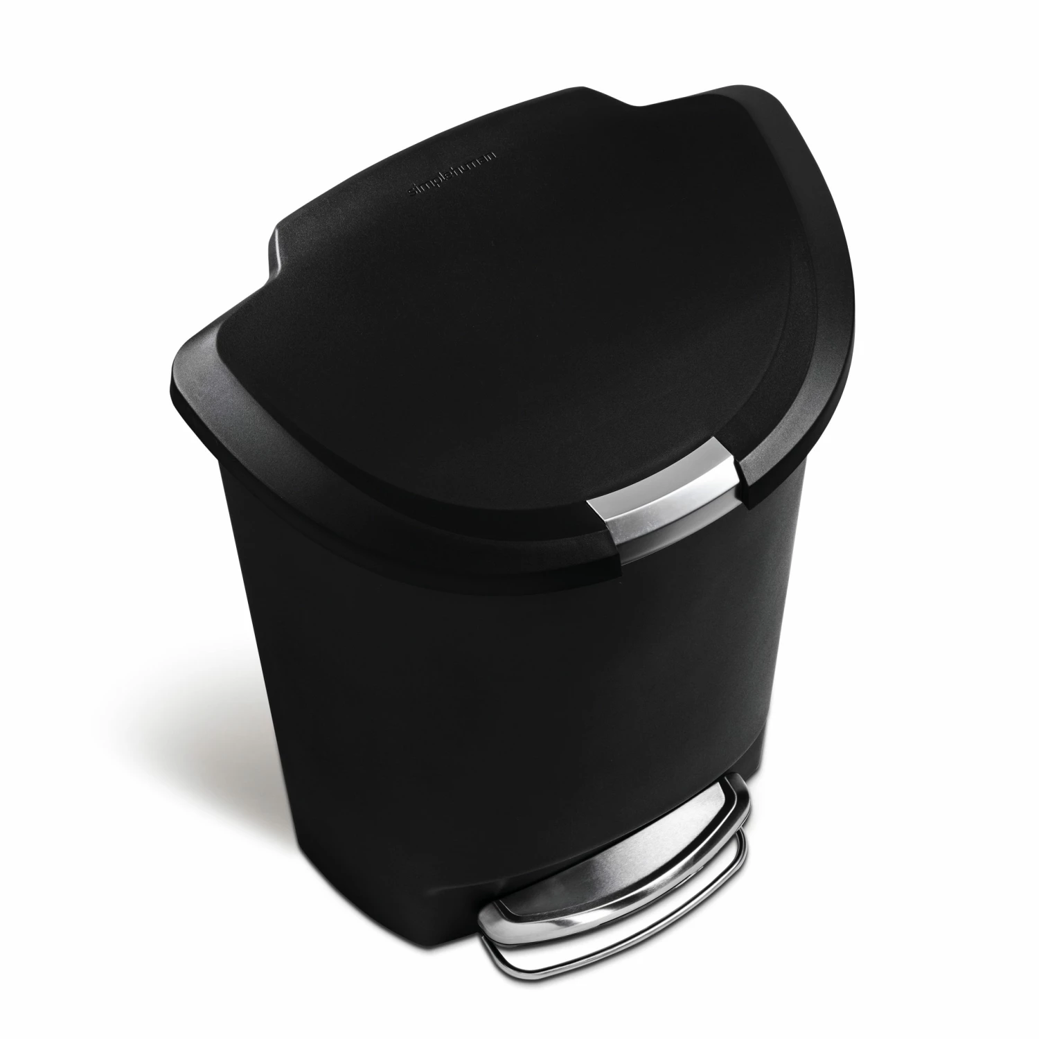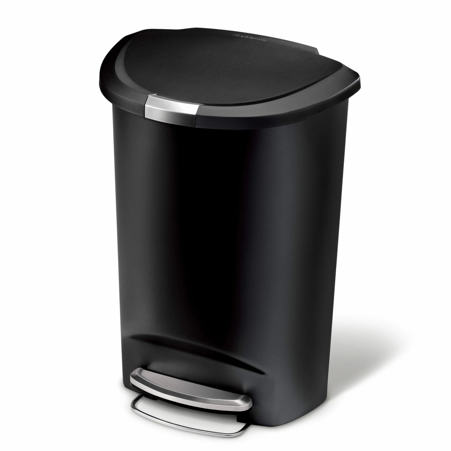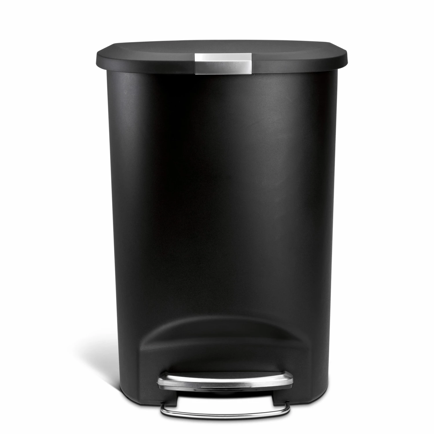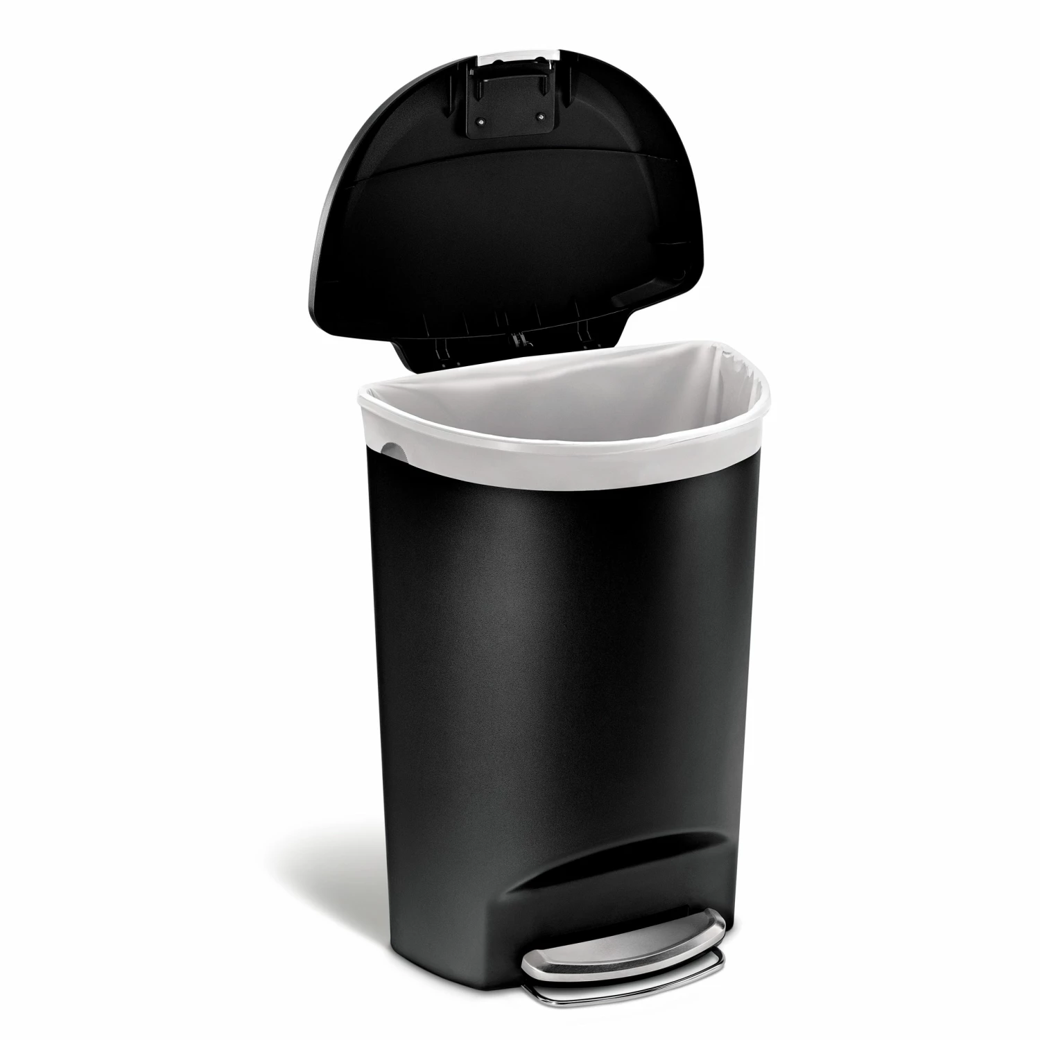 The simplehuman semi-round plastic step can has a flat back for easy placement against the wall and out of the way. Its large capacity also makes it an ideal choice for busy areas around the home. It has a strong steel pedal that is designed to last, and patented lid shox® technology ensures a smooth, silent close every time. A slide lock helps keep trash in and pets and curious children out. The code P liner (item # 703668) fits this can perfectly — no bunching or slipping for a cleaner trash experience.